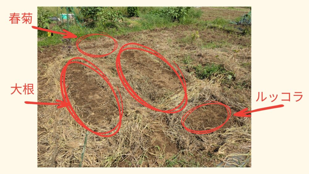 大根、ルッコラ、春菊の畝はこのような感じ。
