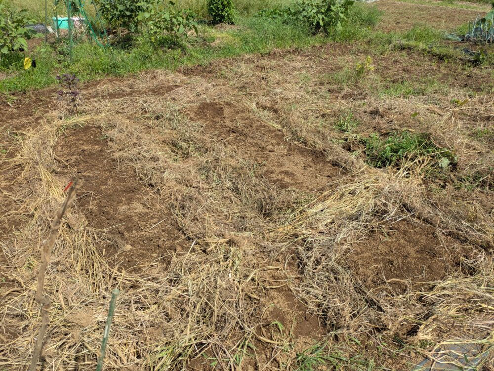 大根を植える畝の箇所は8月のうちに堆肥を鋤きこみ、多少の土壌改善(柔らかさUp)を狙っていました。が、実際は水分を多めに含み、かなり粘度質気味。そこで、畝の高さは20センチほどになるように高くせり上げて作ることにしました。また、畝を高くすることで乾燥の影響は受けやすくなるため、側面には草マルチとして薄くではありますが草をかけることにしました。
