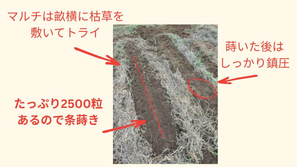 今回は2500粒の種をなるべく使い切るため、ぜいたくに条播でたっぷりと蒔きました。古い種のため発芽率は低いと思います。いくらか芽が出て収穫までもっていけたら嬉しいです。