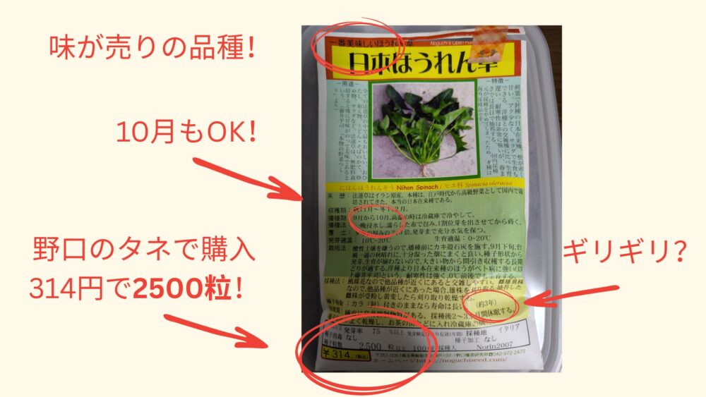 今回植えたホウレンソウはこちら。日本ほうれん草です。こちらの品種は説明文にもある通りあくが少なくサラダでも食べることができ、甘みもある非常においしいほうれん草です。その種が314円で2500粒!しかし、買ったのが本ブログで時々出てくる3年前…。説明文には約3年は大丈夫と記載されているので、発芽してくれることを信じてます。