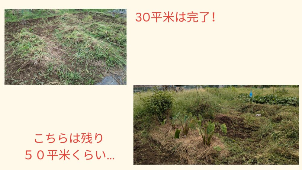 今回は秋・冬野菜の栽培に向けて刈った草の資源としての活用について紹介しました。私の畑は2つのうち片方は何とか草刈りを終了、もう片方が残り半分ほど。今週末は草刈りを終えた畑に大根を蒔き、もう片方の草刈りを終えることが目標です。